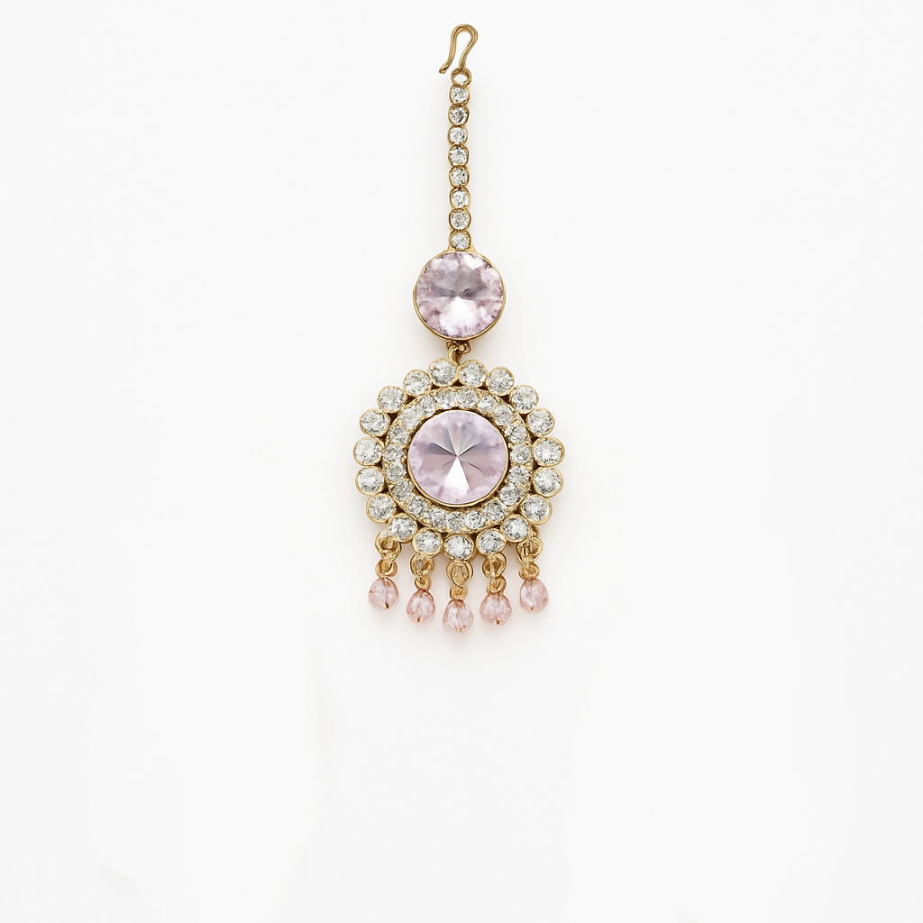 This stunning maang tikka and earring set blends traditional Indian design with modern craftsmanship. Featuring a rose gold-plated base, the central element is adorned with sparkling American diamonds in a circular motif, highlighted by elegant lavender stones and delicate pink bead danglings. Ideal for weddings, festivals, and special occasions, this set is lightweight, skin-friendly, and finished with intricate detailing to complement any outfit—whether it’s a classic lehenga or a contemporary saree. Handcrafted by expert artisans, this jewelry set adds a regal and sophisticated touch to your personality and style.